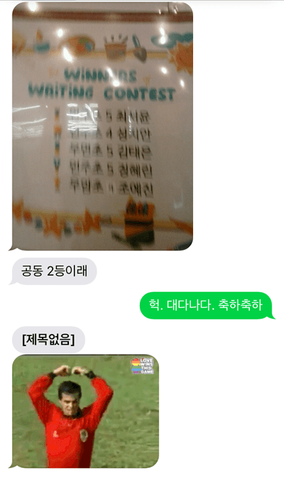 보아하니 1등 빼고 다 2등이라고 해준 거 같은데 축하한다고 답장 보냈더니 날아온 짤 보고 어이가 없어서… 얘는 저런 짤을 핸드폰에 가지고 다니는 건가…-_-