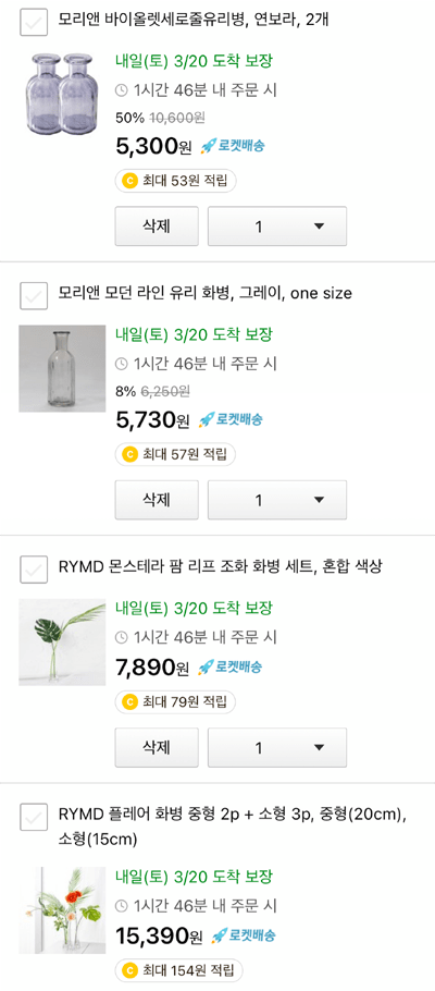 꽃다발이 작아서 목이 좁은 화병이 아쉽길래 앗싸, 하나 사야지 하고 신나게 이것저것 장바구니에 담다가 혹시 몰라서 찬장을 뒤져보니 백만년전에 이케아에서 산, 사이즈마저 딱 적당한 목이 좁은 화병이 나왔다.